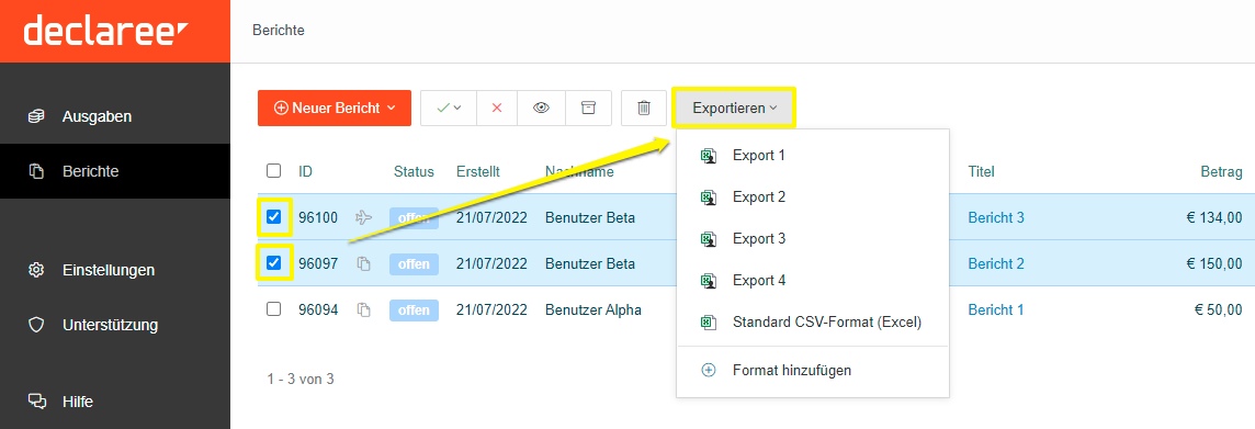Administratoren können genehmigte Berichte direkt von der Berichtübersicht in Declaree exportieren. Sie können entweder jeden Bericht einzeln oder mehrere Berichte gleichzeitig auswählen indem sie das Kästchen neben jedem Bericht ankreuzen. Nach der Auswahl können Sie auf "Exportieren" klicken und das gewünschte Exportformat auswählen:
