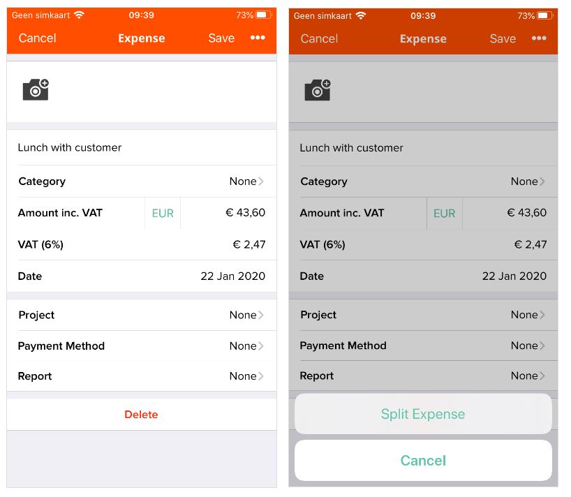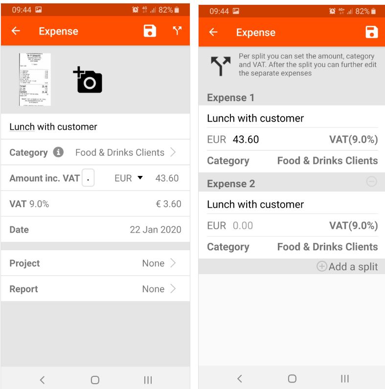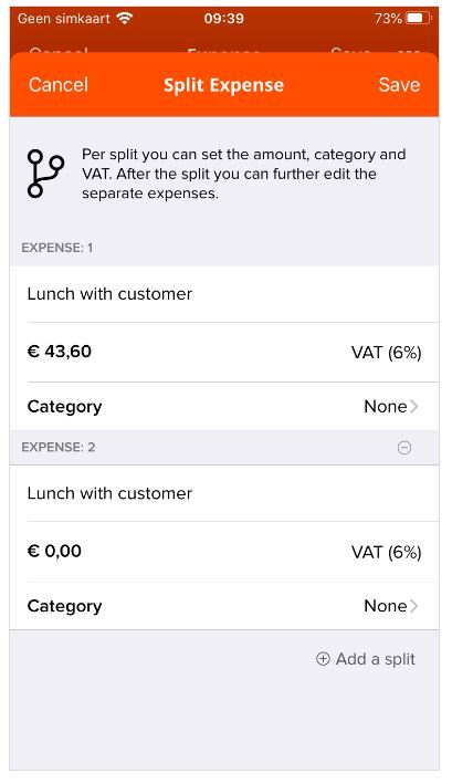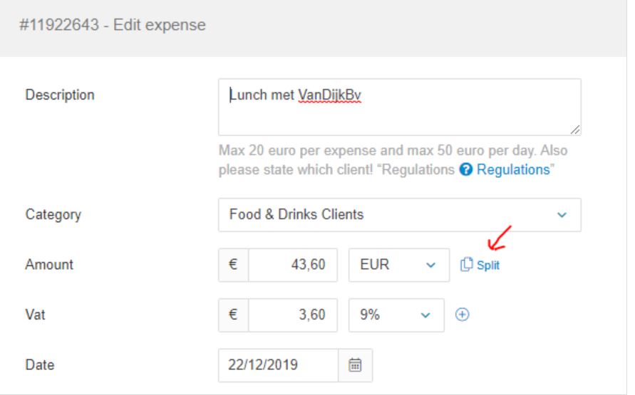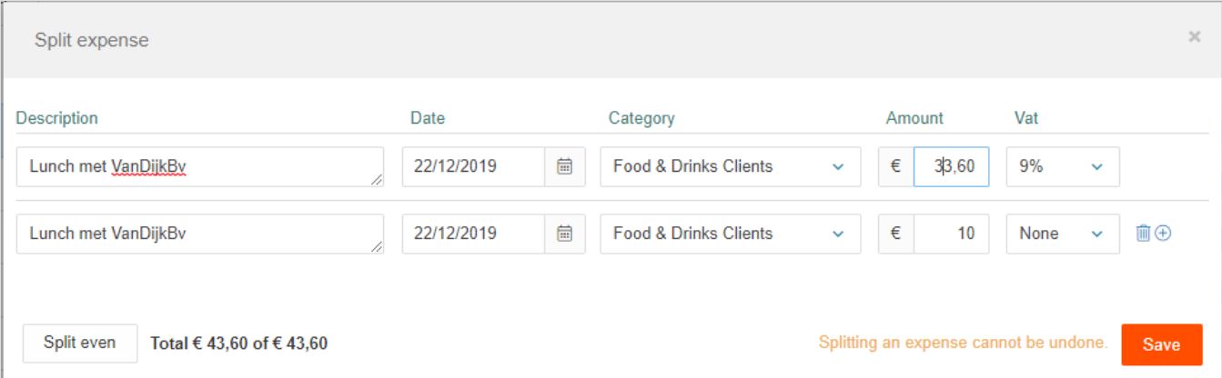 Ausgaben müssen gegebenenfalls aufgeteilt werden. Auf diese Weise ist es möglich, eine Ausgabe auf zwei verschiedene Arten zu buchen. Sie können dies z.B. für Trinkgelder, einen Hotelaufenthalt mit Frühstück, zwei Mehrwertsteuersätze usw. verwenden. Für jede Aufteilung können Sie den Betrag, die Kategorie und die Mehrwertsteuer festlegen. Nach der Aufteilung können Sie die einzelnen Ausgaben weiter bearbeiten.