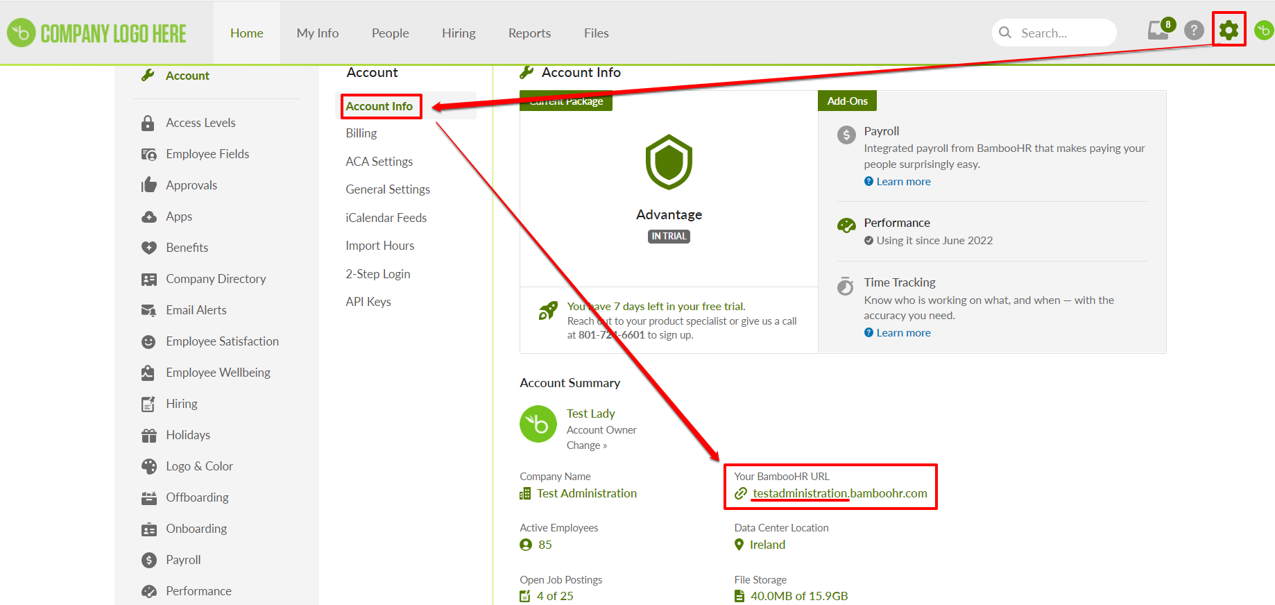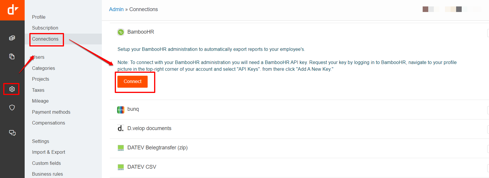 1) Go to "Settings" > "Connections" > "BambooHR" and connect
