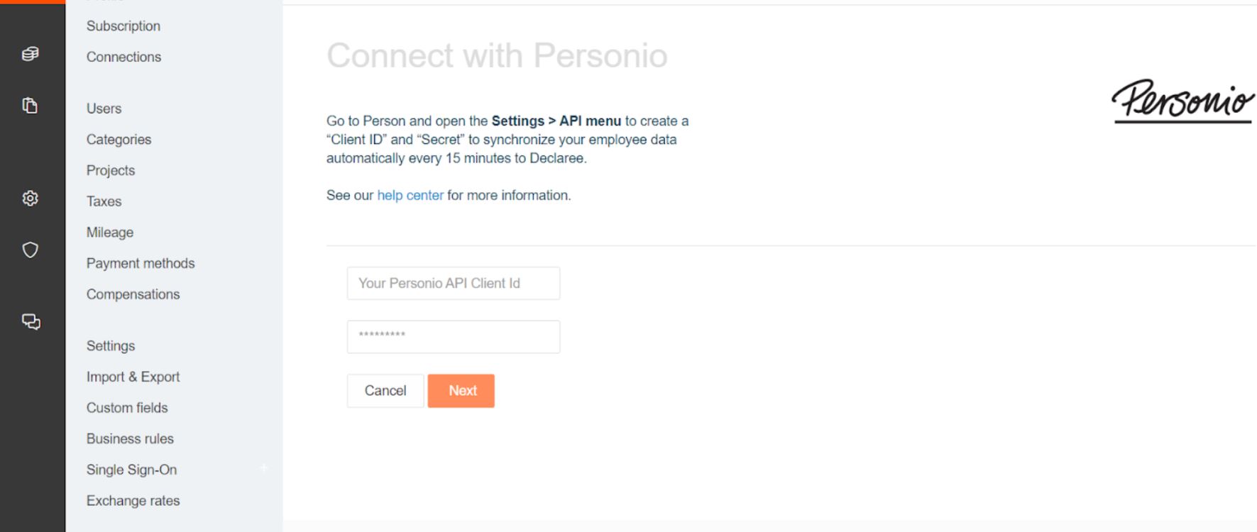 Follow these steps to connect your Personio and Declaree accounts: