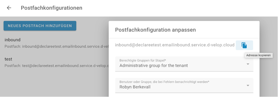 Ga als beheerder naar de tegel "Configuratie" in uw d.velop administratie. Klik in de tegel "Inkomende mail" op "E-mail opslag instellingen". Klik vervolgens op "Nieuwe mailbox toevoegen".