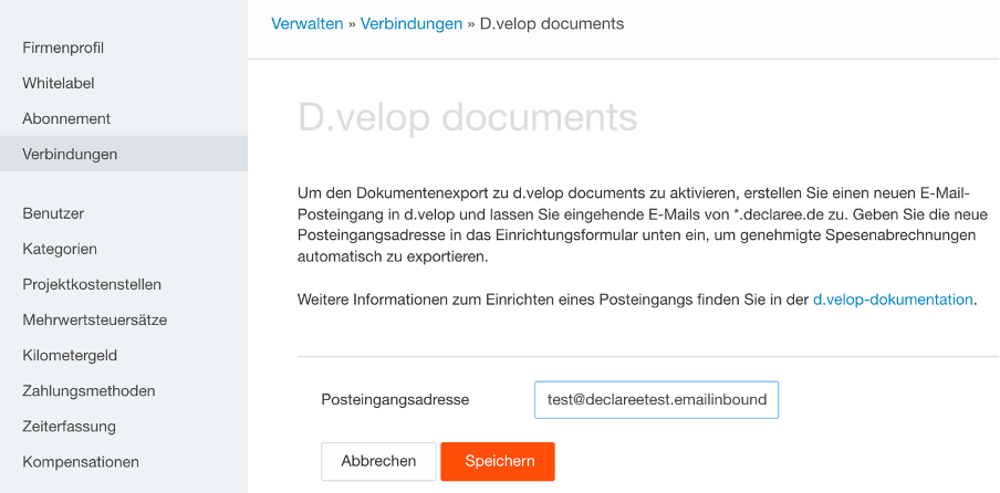 Ga als beheerder naar Configuratie > Verbindingen in de Declaree webapplicatie en selecteer d.velop documenten (let op: deze functie is alleen beschikbaar als uw d.velop Cloud al verbonden is met Declaree).