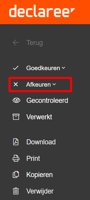 Als dit het geval is, moet het rapport door de manager of eindgoedkeurder worden afgekeurd. Hiervoor moet het rapport worden geopend vanuit het rapportoverzicht. Daarna klikt u links op 'Afkeuren'.