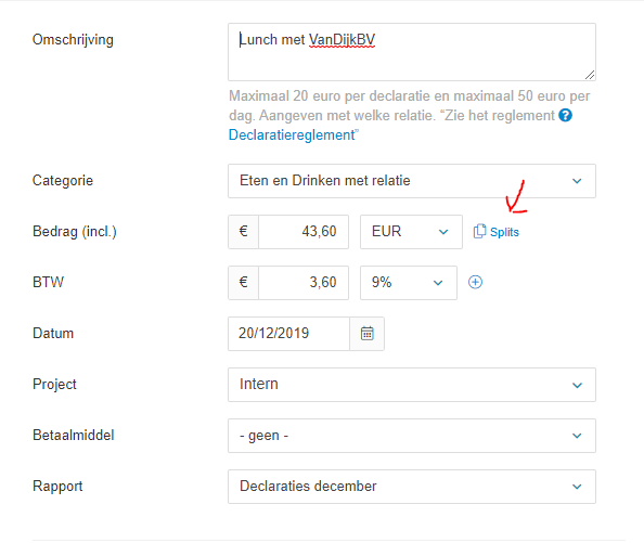 Soms moet één declaratie op verschillende manieren worden geboekt. Door een declaratie te splitsen kun je deze verdelen in meerdere onderdelen met elk hun eigen details.