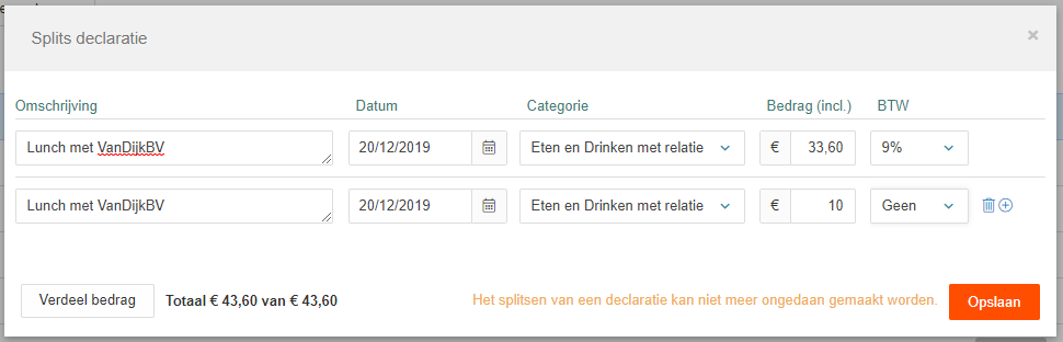 De declaratie verschijnt nu als twee afzonderlijke regels in je overzicht.