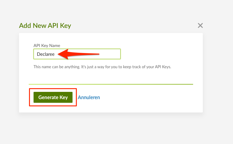 3) Voer een naam in (bijv. Declaree) >> ''Generate Key'' >> Kopieer sleutel naar Declaree