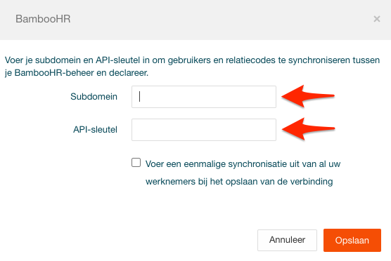 2) Vul hier de vanuit BambooHR gekopieerde subdomein en API sleutel in >> ''Opslaan''