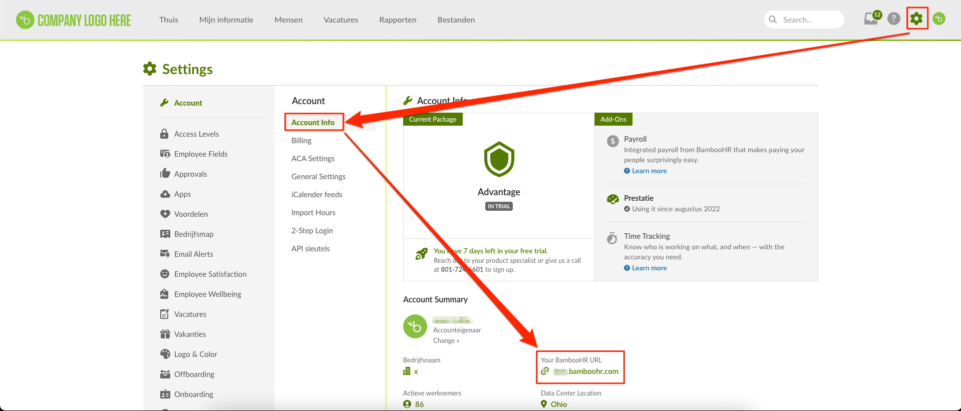 1) Open de instellingen door op het tandwiel icoon te klikken, rechts bovenin het scherm >> Ga naar ''Account info'' >> Onder ''Account Summary'' kun je het subdomein vinden >> Kopieer het subdomein naar Declaree